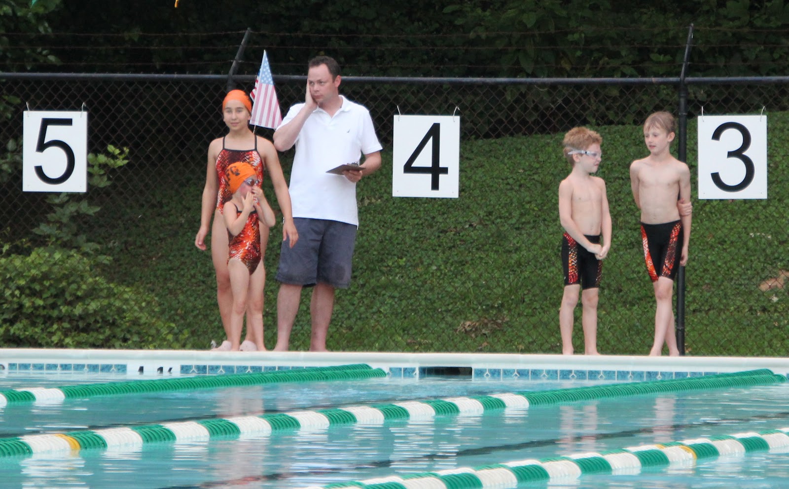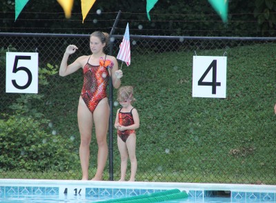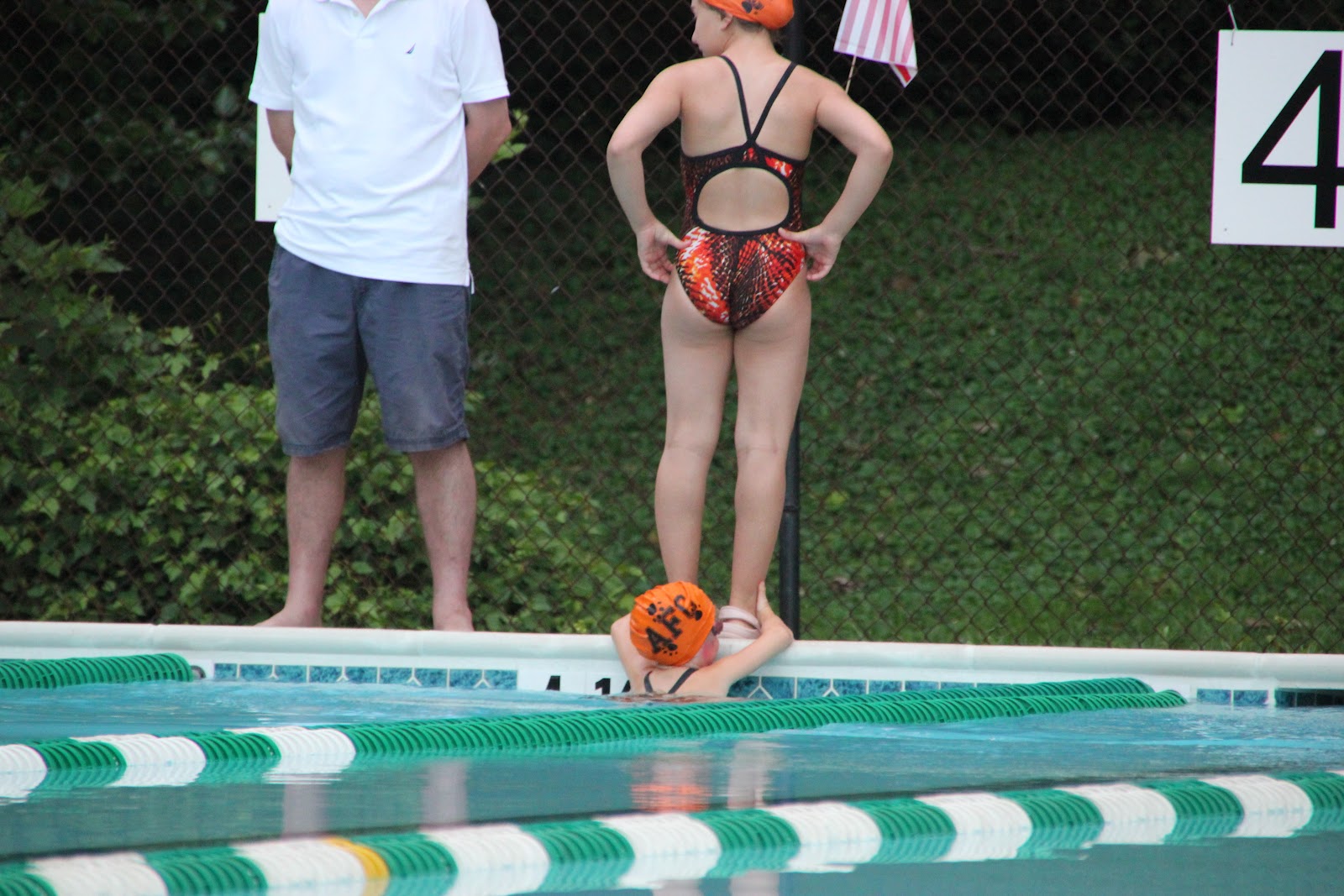 Lorelai about to swim 25 meter backstroke in lane 4 and her brother in lane 3.